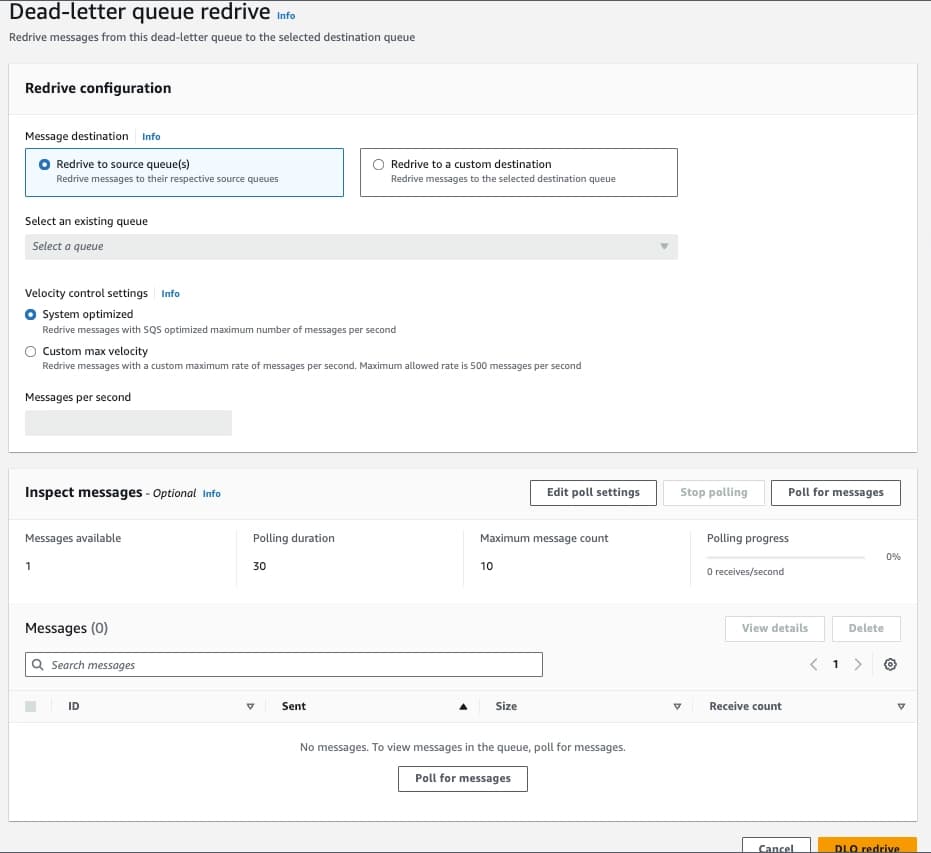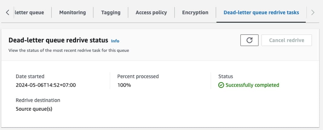 Lastly, let's redrive the message back to the main queue to test whether our policy works or not