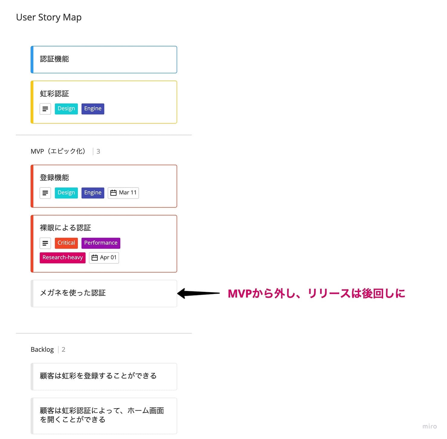 次は、機能をエピック単位に分解し、MVPとそうではないものを分類します。MVPから外れたものは、その機能内で優先度を下げます。場合によっては、他の機能の優先度と比較して、開発を後に回すこともあります。
